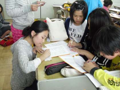 修学旅行の係活動が決まりました。班長は,出発式や平和集会,解散式などの司会進行も務めます。今日は,放課後,2クラス14名の班長が集まって,その練習をしました。みんな意欲的で,言葉を考えたり2人組で言い合って確認したりすることができていました。修学旅行が楽しみですね。