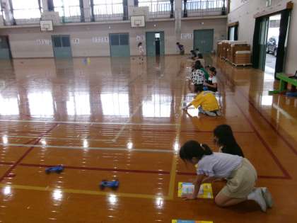 風を強くしたり弱くしたりすると、また、ゴムののびちじみで、ものを動かすはたらきはどのようにかわるのか、学習しています。