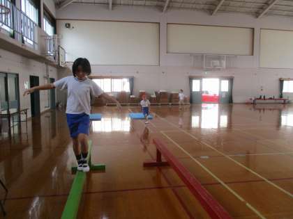 くすのき学級では、体育の時間にサーキットトレーニングをしました。けんぱをしたり、平均台を歩いたりして体を動かしました。