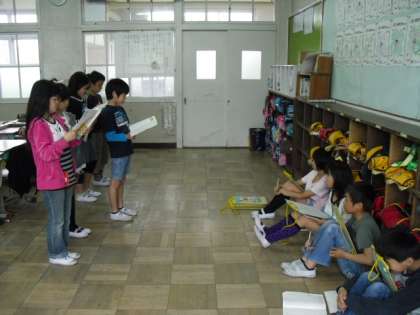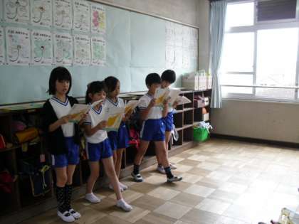 子ども達は声の大きさや強弱,間,表現の仕方を考え,また一人で読むところや二人で合わせて読むところ,さらには班全員で読むなど音読の仕方を工夫して発表していました。音読を聞いていると情景が浮かんでくるようなとても上手な読み方でした。