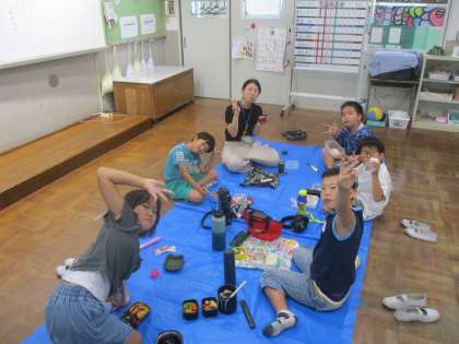 残念ながら天候により育成合同運動会が中止になりました。ですが、保護者の方からのお弁当を楽しみにしていました。ブルーシートを敷いて輪になって食べました。ピクニック気分を味わえたみたいでみんな楽しそうでした!