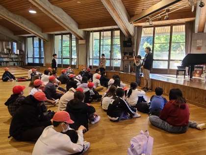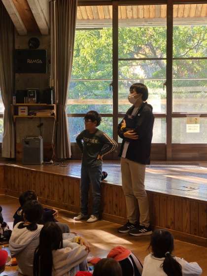 スコアオリエンテーリングの振り返りをしています。レク係を中心に話し合いができています。この後は部屋に入って少しの休憩です。