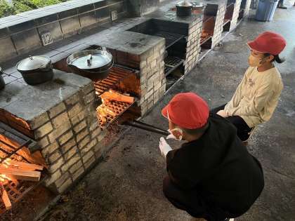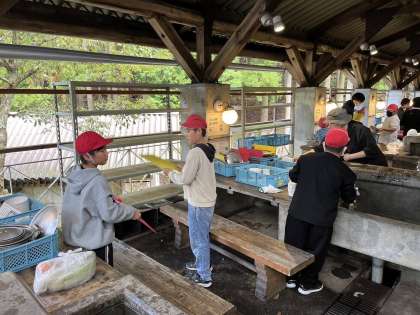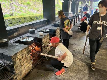 野外炊事の様子です。火の係と料理の係に分かれて作業します。