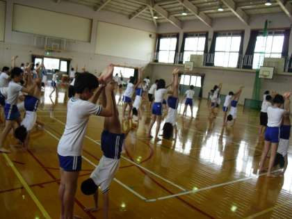 今日は,学年体育でした。組体操の練習をしています。腕の力を使って,自分の体重を支えるってなかなか難しいんですね。運動会まで,あと3週間です。息の合った6年生の勇姿をご覧いただけるよう,練習をがんばります♪