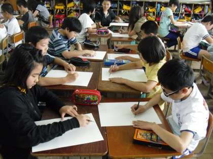 向島東中学校から美術の若狭先生に来ていただき,図工を教えてもらっています。今日は,「友達の紹介」と題し,隣の席の友達をよく知り,描いていくこととなりました。質問をし合いながら,よく見て,スケッチをしました。