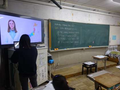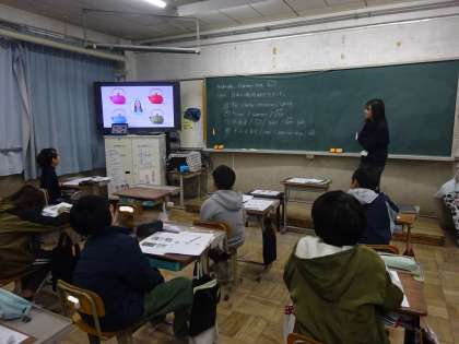 向島東中学校でも先生をしている英語の教員に週1回授業をしてもらっています。