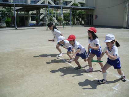 今日の体育はいつものリレー遊びとは違い、初めてトラック1周を走りました。