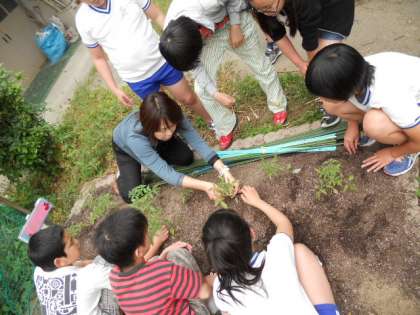 食中毒予防のバイキンを「つけない、ふやさない、やっつける」で元気に過ごしてほしいと思います。保健委員会で育てているトマトの苗「りりこ」も、今日、大きな実をつけるようにと「芽かき」をして、小さな芽を摘みました。苗を直接触るまでにしっかりと手洗いをして「いらない病気をつけない、いらない芽をふやさない、害虫をやっつける」で芽かきをしました。元気に育ってほしいと思います。