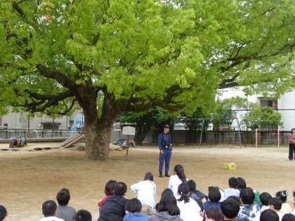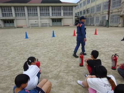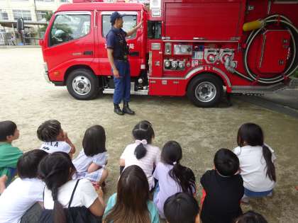 今回は、1年生が消防車見学、4・6年生は消火器体験をしました。