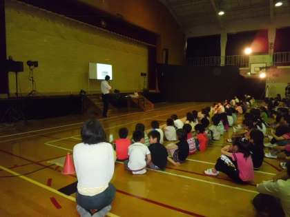 記念式では,校長先生から向島の歴史や学校の歴史についてお話を聞きました。