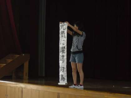 今日は,4年生の詩の発表・委員会からのお知らせなど,盛り沢山の児童朝会でした。今年の児童会のスローガンは,『元気に躍進!! 向島』です。各学級で考えてくれたものをさらに練って,計画委員会で決めました。躍進とは,大きく羽ばたくという意味があり,みんなが元気よく登校し,あいさつし,一生懸命に学習できる向島小学校にしようという意味を込めたものです。今年のスローガンの通り,もっともっと素敵な学校にしましょうね。