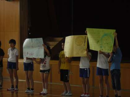 各委員会から,給食委員会からの「牛乳のたたみ方」について・図書委員会からの「あじさい読書週間」について・保健委員会からの「ぶくぶくうがい週間」について・計画委員会からの「今年度のスローガン」についてのお知らせがありました。