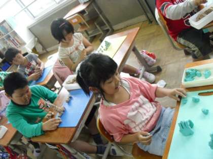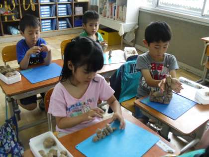 今日は図工「ねんどでつみき」を学習しました。