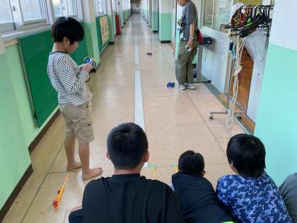輪ゴムを多く使っても車の走る距離が伸びないことに気づき、「輪ゴムが多いとクラッシュしやすいな」「1本ずつ減らしてみよう」「発射台の長さを変えたらどう?」など、試行錯誤しながら取り組む姿が見られました。