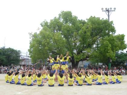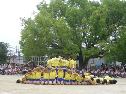 いよいよ組体操の番。練習の成果を見せるべく,緊張の面持ちで組体操の演技にのぞみました。記念Tシャツの黄色の色が運動場に生え,一技一技きめていく姿にたくさんの拍手。さすが6年生。決めるときは,しっかり格好よくきめてくれます。どの演技も本当にすばらしかったです。