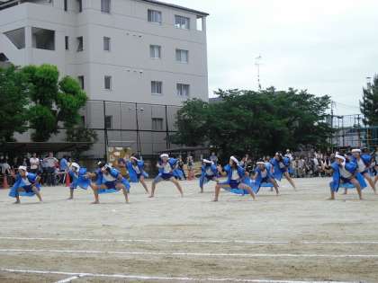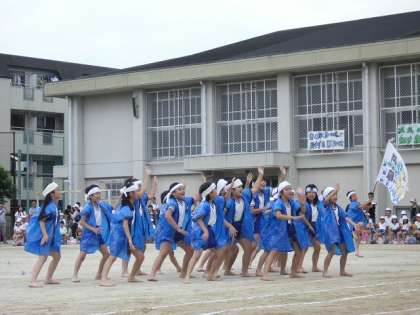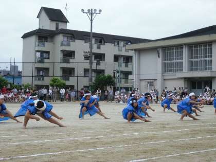 4年生は団体演技『南中ソーラン』を踊りました。今までの練習では,腰を落としてひざを曲げること,テンポの速い音楽に合わせて動くこと,36人全員が一緒になって動くこと,息を合わせること,どれもこれも何度も何度も繰り返してできるようになりました。