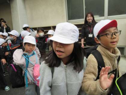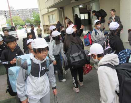5年生が今日から花背山の家に出発です。急に気温が下がり、少し寒くなりましたが子どもたちは元気いっぱい笑顔で出発しました。