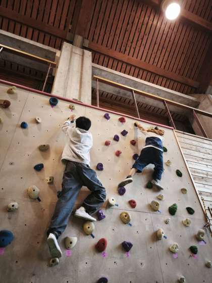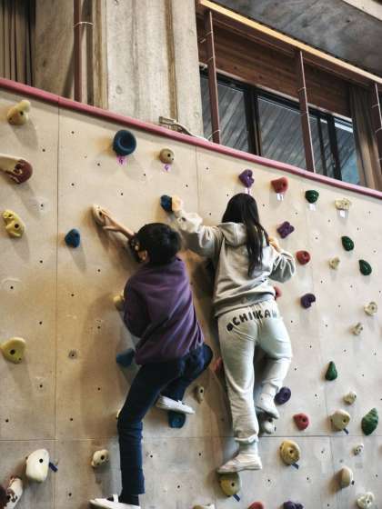 ボルダリングをしています。高いところが苦手な子も自分のできるところまで挑戦しています。