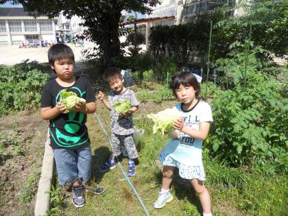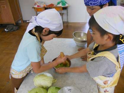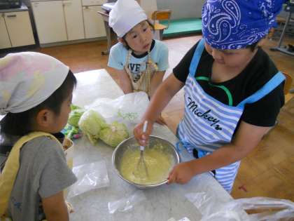 キャベツのホットケーキつくり 公開日 2012/06/14 更新日 2012/06/14 くすのきの部屋 今日は、くすのきの畑でとれたキャベツを使って、ホットケーキを作りました。 とれたてのキャベツを切って、ゆがいて、すり鉢でつぶしたものをホットケーキのもとに入れてホットプレートで焼きました。子供たちは「しろくまちゃんのホットケーキとおんなじや。」とか「ぐりとぐらみたい。」「おいしい。」「いっぱい食べられる。」と言いながら、ちょときみどり色のホットケーキをおいしくいただきました。