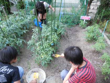 昨日は運動会,どの学年の児童も一生懸命がんばっていましたね。運動会の途中でしんどくなる人も少なく,大きなけがも無く,運動会は終わりましたが,やはり疲れが残っている児童が多いようです。今日は朝からけがをする人がとてもたくさん保健室に来ました。いつも遊んでいる慣れた遊具なのに,なぜかけがをしてしまう児童が低学年に目立ちました。大人に比べて子どもは「疲れ」に気付きにくいものです。湯船につかって全身の筋肉をゆるめる,いつもより30分早く寝る,からだの調子を整える食事(ビタミンが豊富な野菜類やタンパク質など)をとることが効果的です!ご家庭でもぜひお試しください。そして,保健委員会で育てているトマトの苗「りりこ」も,なんと「尻腐れ症」という実が黒くなってしまう病気にかかってしまいました。緊急処置として,今日保健委員会の児童と特別な肥料を与えました。調子が悪くなったらすぐに対応は植物も人間も一緒ですね。早く良くなりますように・・・・・