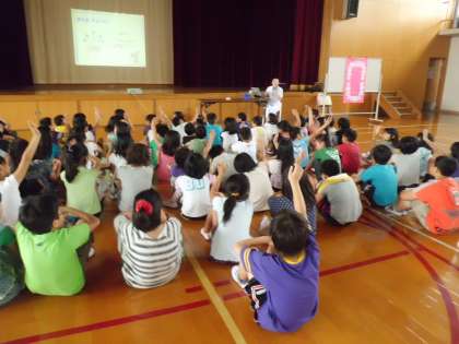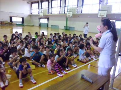 台風が接近する中、3年生4年生は4時間目に体育館で「はみがき指導」を受けました。向島小学校では4年生までは1年に1回だけ、歯科衛生士さんが学校にきていただいて、歯の勉強をしています。歯ブラシの使い方をみんなで練習して「ツルツル、スベスベ」の歯を体験しました。3年生も4年生も3回目4回目の指導になります。話を聞く姿勢はとてもすばらしく、最後の質問コーナーも歯科衛生士の高内先生に直接たくさん質問することができていました。みんなとても頼もしい歯磨きリーダーに育っています♪風がつよくなってきました。明日は晴れて元気に登校してきてください。