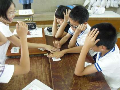 今日の外国語活動は,英語活動のLesson3をしました。テキストの絵から,二人組になり,友達のできること・できないことを予想し,英語でインタビューをしました。その次には,グループごとにカルタを使ってゲームをしました。