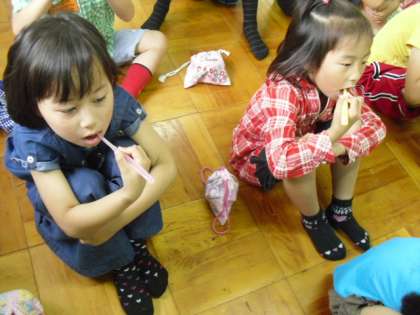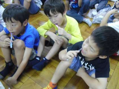 という、歯に大切にするための話を聞いた後、正しい歯みがきの仕方を学びました。