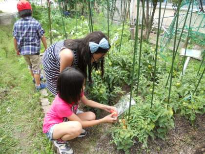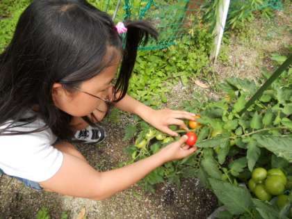 台風や大雨と、天候不順な日が続きます。今週はいつもより熱や腹痛で欠席する児童が増えています。水泳学習も始まり、疲れと気温の差が身体の抵抗力を低下させています。特効薬は「寝ること」しっかり「食べること」しかありません。季節が変わるこの時期は,子どもも大人も夜はいつもより早く、食事はいつもよりビタミン類(野菜や果物など)を多めにすると体調がととのいますね。風雨にさらされても、保健委員会で育てているトマトの苗「りりこ」は、いよいよ赤くなり、収穫の時期を迎えました。「トマトが赤くなると医者が青くなる」といわれるくらい、トマトの栄養価はとても高いです。9月の調理を楽しみに、病気、害虫の予防を続けて,完熟を目指します♪