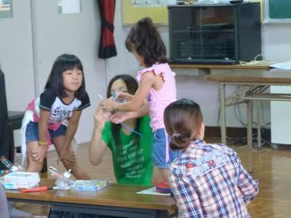 お話の後,みんなでペットボトルを切ったり,羽にきれいな飾りをつけたりしました。