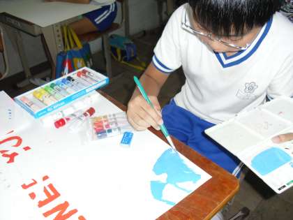 お話の絵を描いています。下絵用の紙を持ち帰り,家でも続きを考えたり,描いてきたりしていました。今日から着色し始めた人もいます。