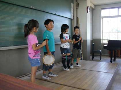 音楽室に行って色々な楽器を見ました。その中で虫の声に使えそうな楽器を選んで