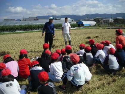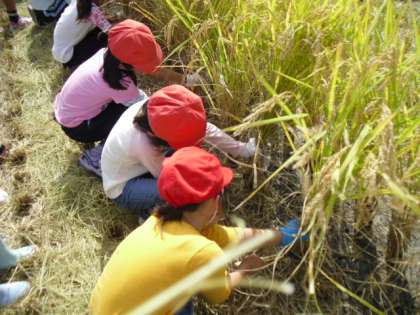 生活科の学習で稲刈りに行ってきました。田植えの時よりも大きくなっているのに気づいてびっくりしている子ども達。