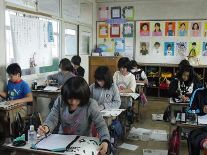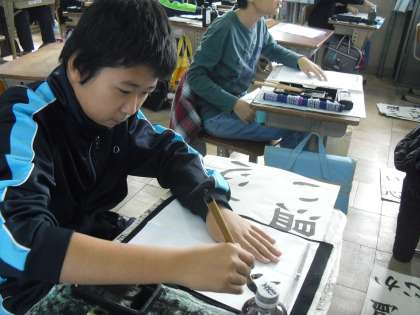 まず,点画のつながりと字配りのしかたを理解しました。そして,文字の大小や字形・行の中心・字間・余白・穂先の向きなどを意識して,集中して書きました。なかなか難しい文字だなぁと言いながら書いていました。