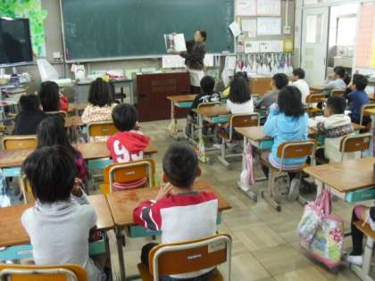 今日は、図書支援員の上岡先生が読み聞かせをして下さいました。