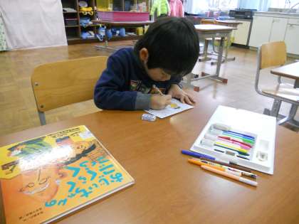 自分の好きな絵本の好きな場面を、絵に描いて文で紹介するのがとても楽しいようで、3人ともすごく集中して取り組んでいました。