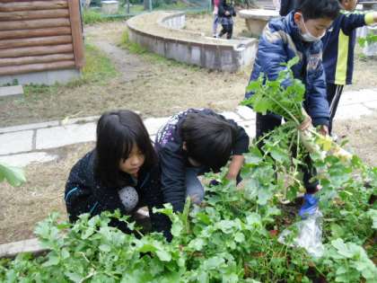 明日に向けて、今日は、みんなで大根の収穫をしました。