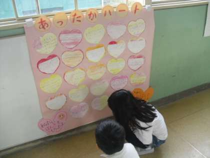 子どもたちの周りにある『あったかい心』をハートに書きました。