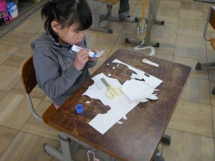 紙を切ってかたちにはっていくのが楽しくて、「あ、これここに使える。」