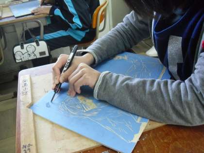 腕相撲をする友達をスケッチし,カーボン紙を使って版木に写しました。白と黒のバランスを考え,彫り進めています。彫刻刀の持ち方や手の置き方など,若狭先生に繰り返し指導をしてもらいながらがんばっています。