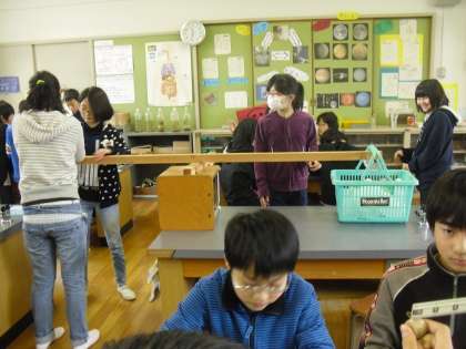 小さな力で,ものを動かすには,てこをどのように使えばよいかを調べました。力点の位置を変えたりして調べていました。同じにする条件と変える条件を明確にし,調べていくことができていました。