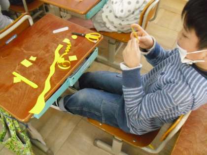 そのあとは、画用紙を細かく切ったり、折ったりして、おめんで使えそうなパーツ作りをしました。