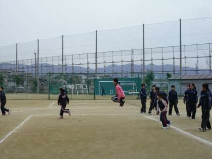 みんなでリズムに合わせて大縄を跳んだり,ラケットの持ち方を教えてもらい実際に打ったりとてもうれしそうな6年生の笑顔。「先生,テニス部入るわ〜。」と終わってから報告にきてくれました。