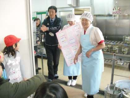 「きゅうしょくちょうりいんさん、これからもおいしいきゅうしょくをつくってください。よろしくおねがいします!」