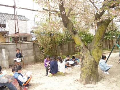 冬とくらべると,生き物のようすにはどのようなちがいが見られるか意見を出し合いました。運動場に出て,校庭のさくらの様子を観察しノートに記録しました。