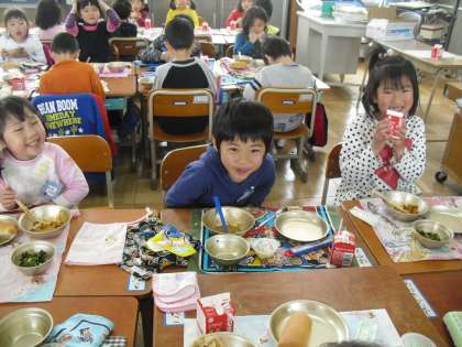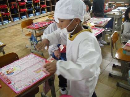 上級生たちの様子をみると,とても手早く配膳をし,もりもりと食べていました。