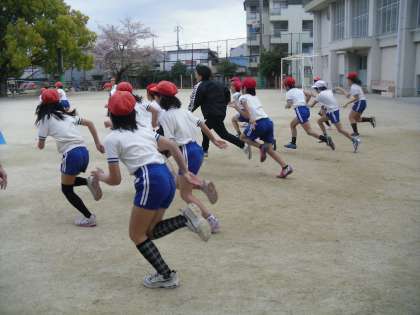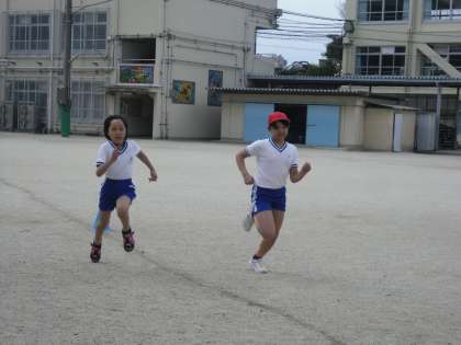 体育で50mの記録を測定しました。スタートラインに立つ子どもたちの顔は意気揚々としていました。速く走るための工夫を考えている子、勝負にこだわる子など様々な顔が見られました。