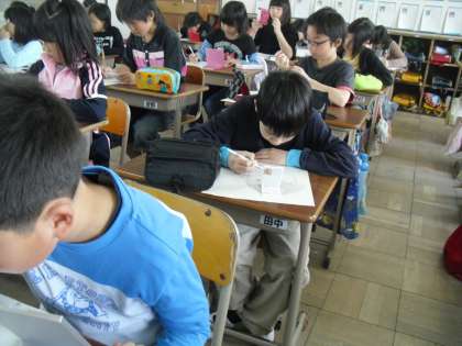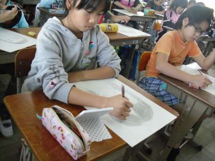 今週は,ステップアップして白地によく映えるコンテの色を自分で選び,線描をしました。来週の図工では,描いた線を残しつつ,自分で肌の色を作って着色していきます。5年生,とっても頑張っていますよ。
