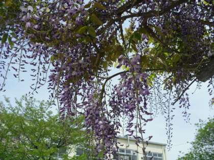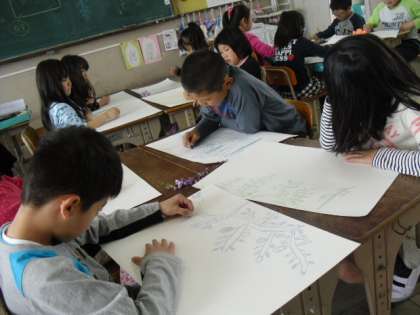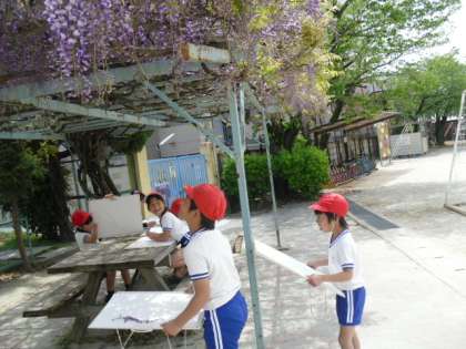 図工2時間目は、学校の東門近くにあるフジ棚のフジを描きました。
