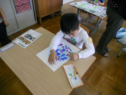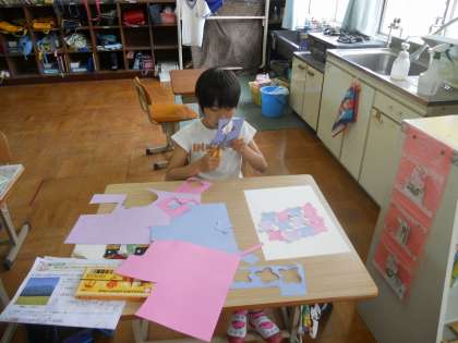 アジサイなので色画用紙を切ったり張ったり,色を選んで描いたりしました。
