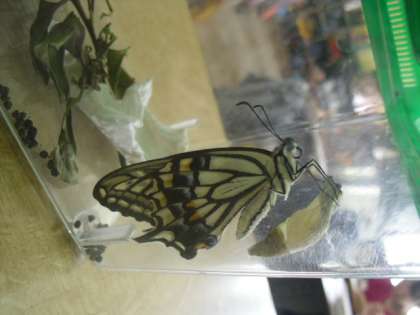 今日の中間休みのあと、蛹から成虫になり、きれいな羽を見せてくれました。